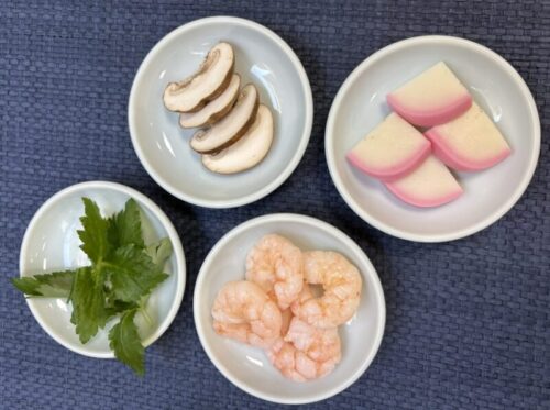 むきエビ2尾、かまぼこ1枚分、しいたけ半分の量を器に入れる。
