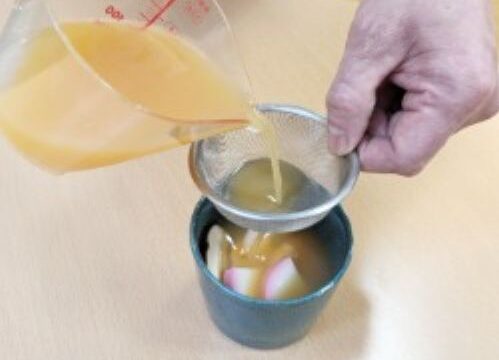 1の卵液を2の器に茶こしでこしながら注ぎ入れる。