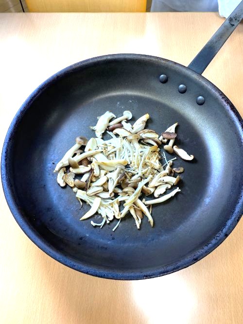 熱したフライパンでしっかりきのこに焼き色をつけることで香りが出ます。