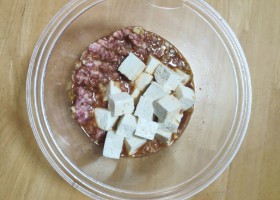 2の耐熱ボウルに豚挽肉と豆腐・長葱を加え、ラップをかけて電子レンジで加熱する。(600Wで9分、500Wで12分)