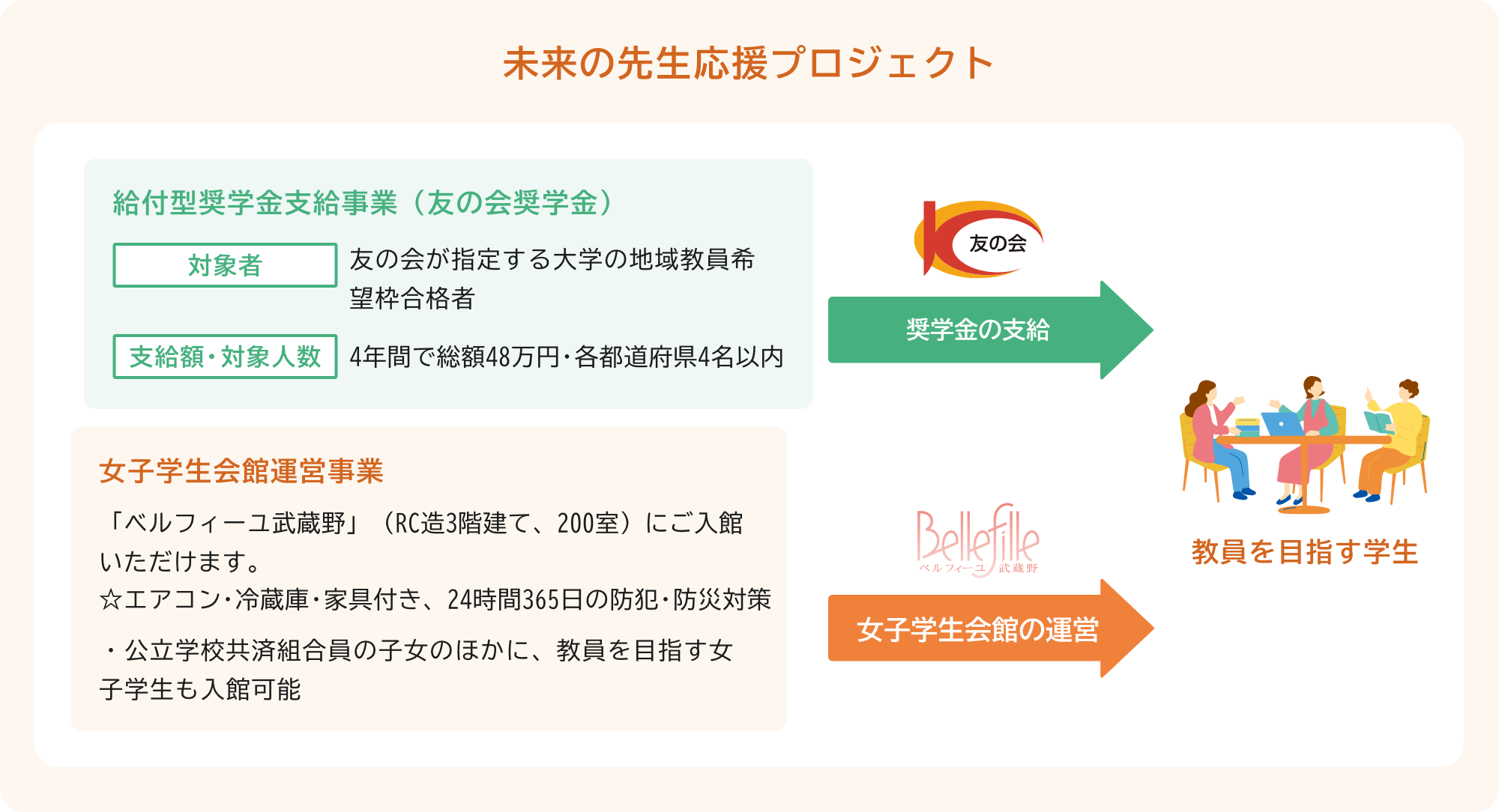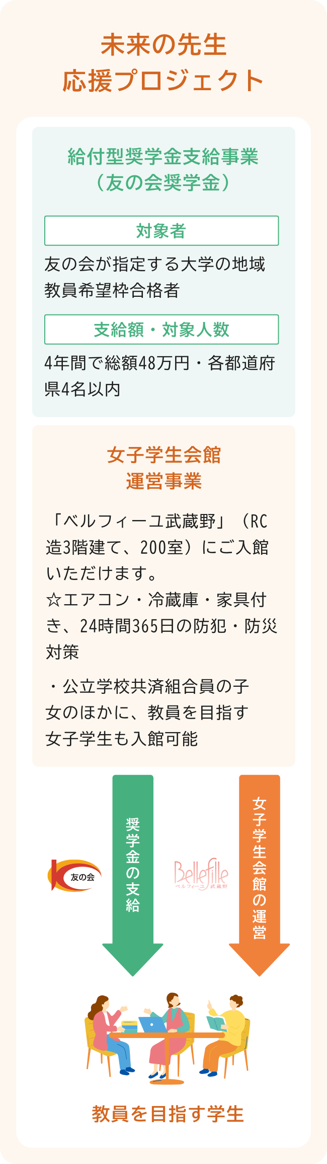 教育は社会すべての土台です。しかし、全国的な教員不足は深刻さを増しています。そこで私たち友の会は、「未来の先生応援プロジェクト」を立ち上げ、これから教員になろうとする学生を応援することにしました。具体的には、奨学金事業と女子学生会館事業です。なかでも、奨学金事業は、多くの方々のご支援をもとに行うものとなっています。あなたも、私たちと一緒に「未来の先生」を応援しませんか。