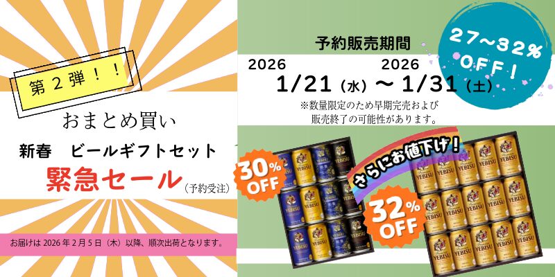2026年1月27日サッポロビール優待サービス★会員限定★ビールギフトセット おまとめ買いの緊急セール 予約販売期間限定の緊急セールビールギフトセットのおまとめ買い、27~32%OFF■販売期間:1月21日(水)~1月31日(土)詳しくは優待サービス画面の「サッポログループパートナーeSHOP」をご覧ください。優待サービスはこちら