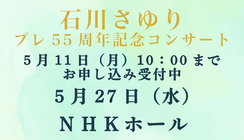 2026年4月14日NHKホール観劇チケットNHKホール 石川さゆり プレ55周年記念コンサート 5月11日(金)までお申し込み受け付け中 【販売開始】石川さゆりプレ55周年記念コンサート石川さゆりプレ55周年記念コンサートのチケット販売を開始しました。名曲の数々を生で楽しめる貴重な機会を、友の会割引価格でご案内しています。ぜひお見逃しなく。チケットの詳細&購入はこちら